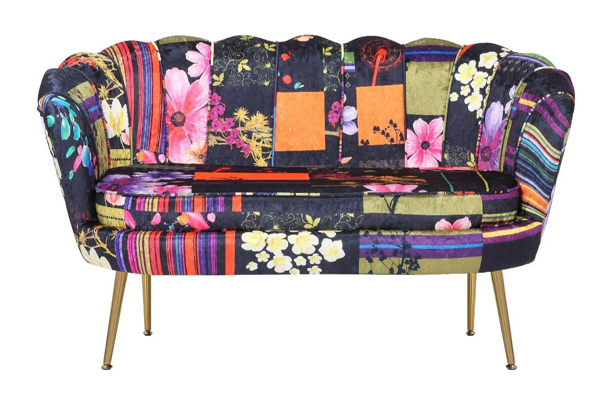 The perfect addition to any stylish living room. With its unique patchwork design, scalloped back, and elegant gold legs, this accent sofa is sure to make a statement in your home. The Fabric Black Patchwork 2 Seater Daisy Sofa is upholstered in high-quality, durable polyester fabric, making it a durable and long-lasting investment for your home.