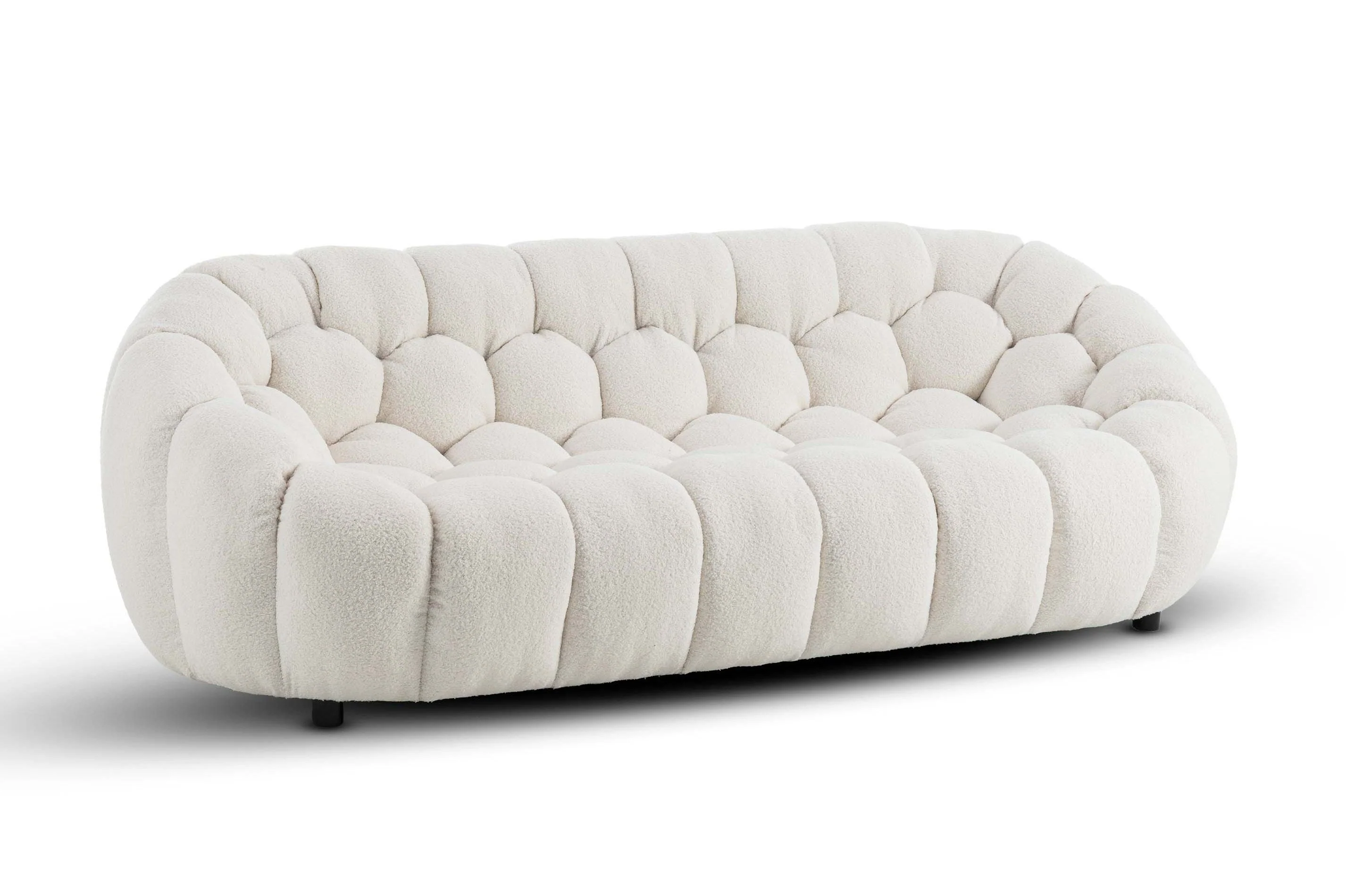 The Atrani range boasts a unique low seating height profile and a distinctive round sectional silhouette, reminiscent of a cloud-like shape, perfectly complementing its curly upholstery. It's ideal for creating a cosy nook in your living room or as part of a chic lounge setup.