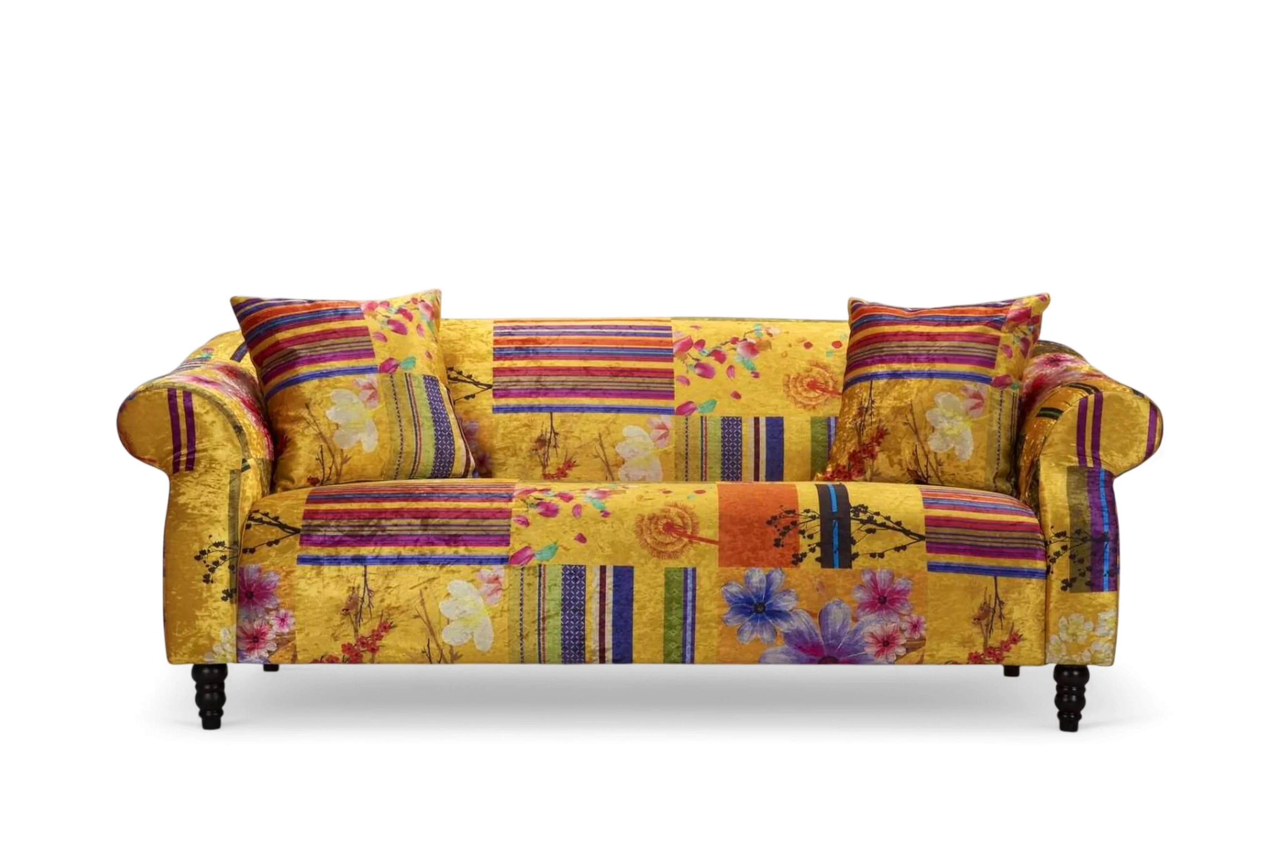 Fabric Gold Patchwork 3 Seater Avici Shout Sofa's distinct patchwork upholstery makes it a true attention-grabber, making a bold statement in any space. Its versatile design allows it to effortlessly complement both modern and classic settings. Whether as a centrepiece or part of a larger collection, this 3-seater sofa is a perfect fit for smaller spaces or spacious living rooms alike.