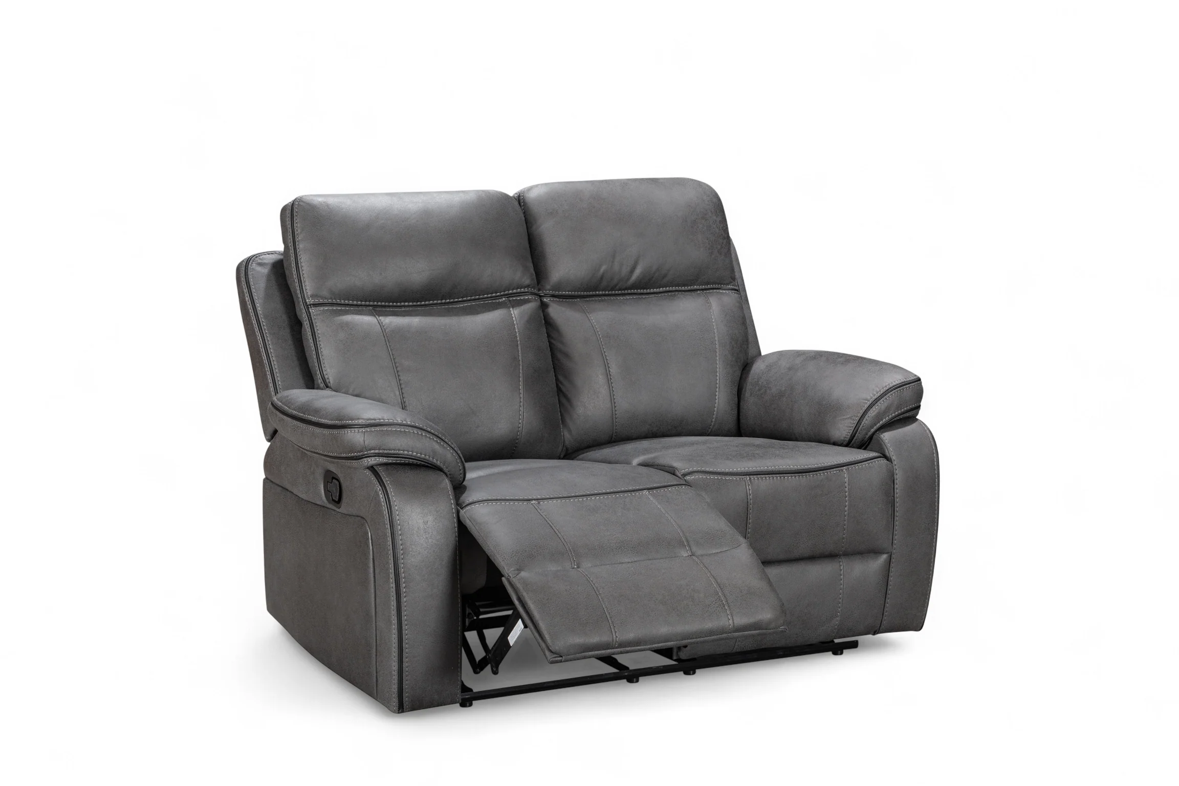 The Vegas Sofa is a multi-functional seating option designed with utility and comfort in mind. Each of the two seats features a lever-operated manual reclining mechanism that controls both the backrest and the footrest. The faux leather upholstery in grey offers styling versatility, and the modern silhouette prioritises comfort. The armrests, backrests, and seats are filled with medium-density foam, and each seat is sprung. The modern silhouette is accentuated by decorative stitching, adding character and uniqueness to this 2 seater recliner sofa. Don't miss out — recline in comfort and make the most of your leisure time.