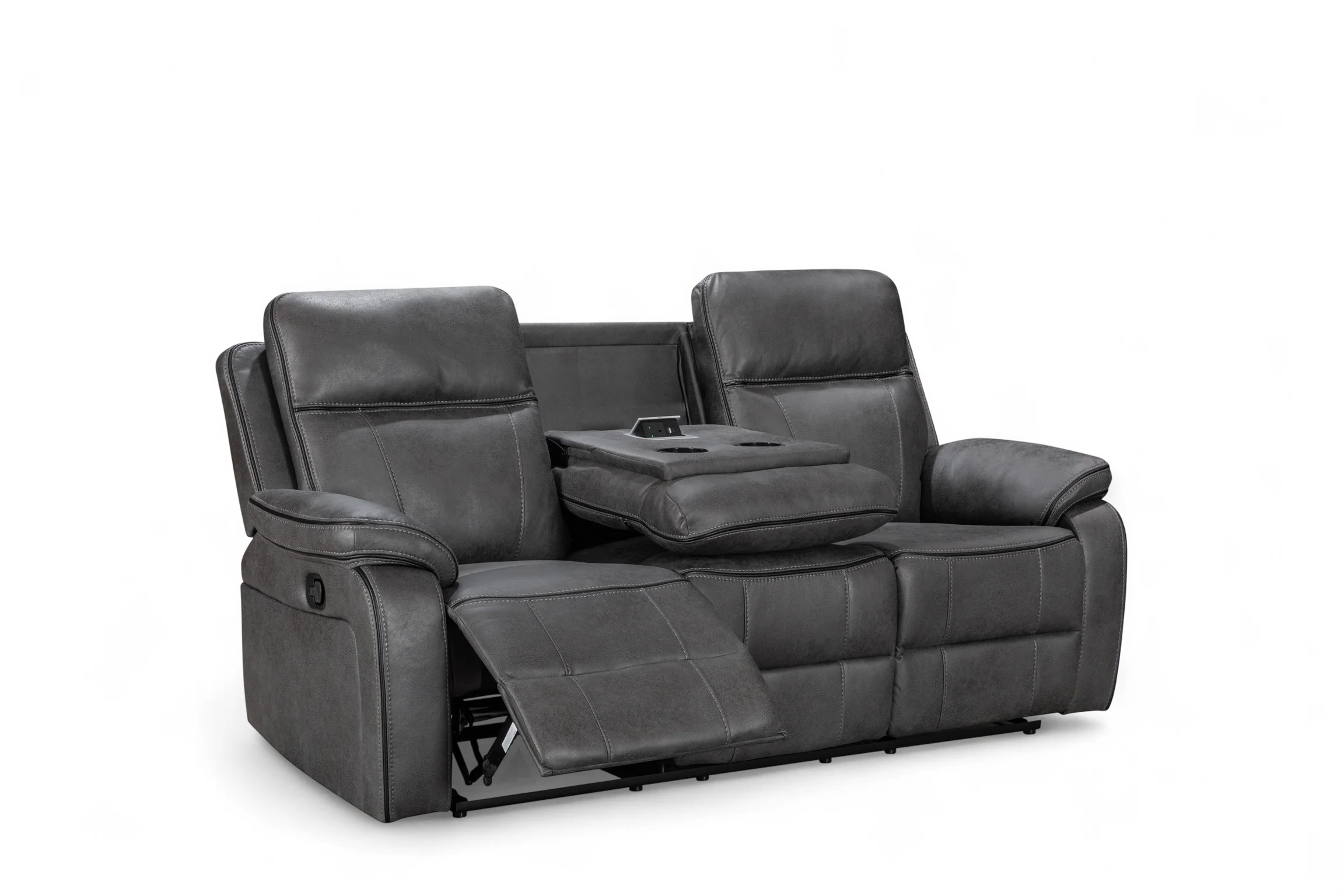 The Vegas Sofa is a multi-functional seating option designed with utility and comfort in mind. The left and right seats feature a lever-operated manual reclining mechanism that controls both the backrest and the footrest. The middle seat does not recline, instead is collapsible to reveal a drop table with convenient cupholders, and a power strip that features a socket, an USB B and USB C ports. The faux leather upholstery in grey offers styling versatility, and the modern silhouette prioritises comfort. The armrests, backrests, and seats are filled with medium-density foam, and each seat is sprung. The modern silhouette is accentuated by decorative stitching, adding character and uniqueness to this 3 seater recliner sofa. Don't miss out — recline in comfort and make the most of your living space and leisure time.