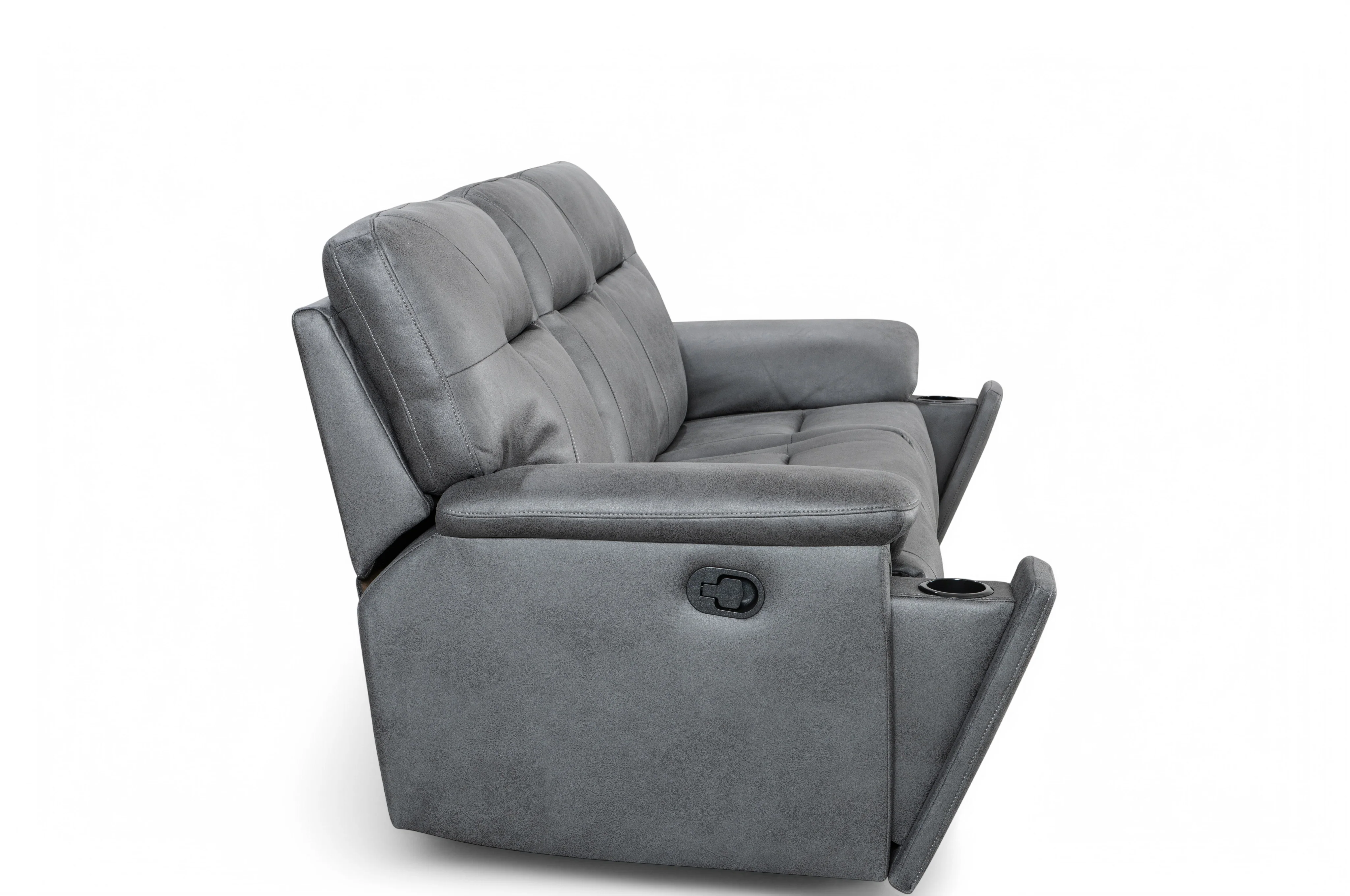 The Murcia 3 Seater offers everything you and your close ones need to rest and catch a break. The manual reclining functionality allows you to adjust to your preferred position, including the footrest. The front armrest sections pull out to reveal convenient cup holders. The classic recliner design and the grey faux leather upholstery offer versatility in adding it to existing decor and modern interiors. The backrest and armrests are well-padded for optimal comfort during your leisure time. Ideal for sitting rooms, as the main seating solution.