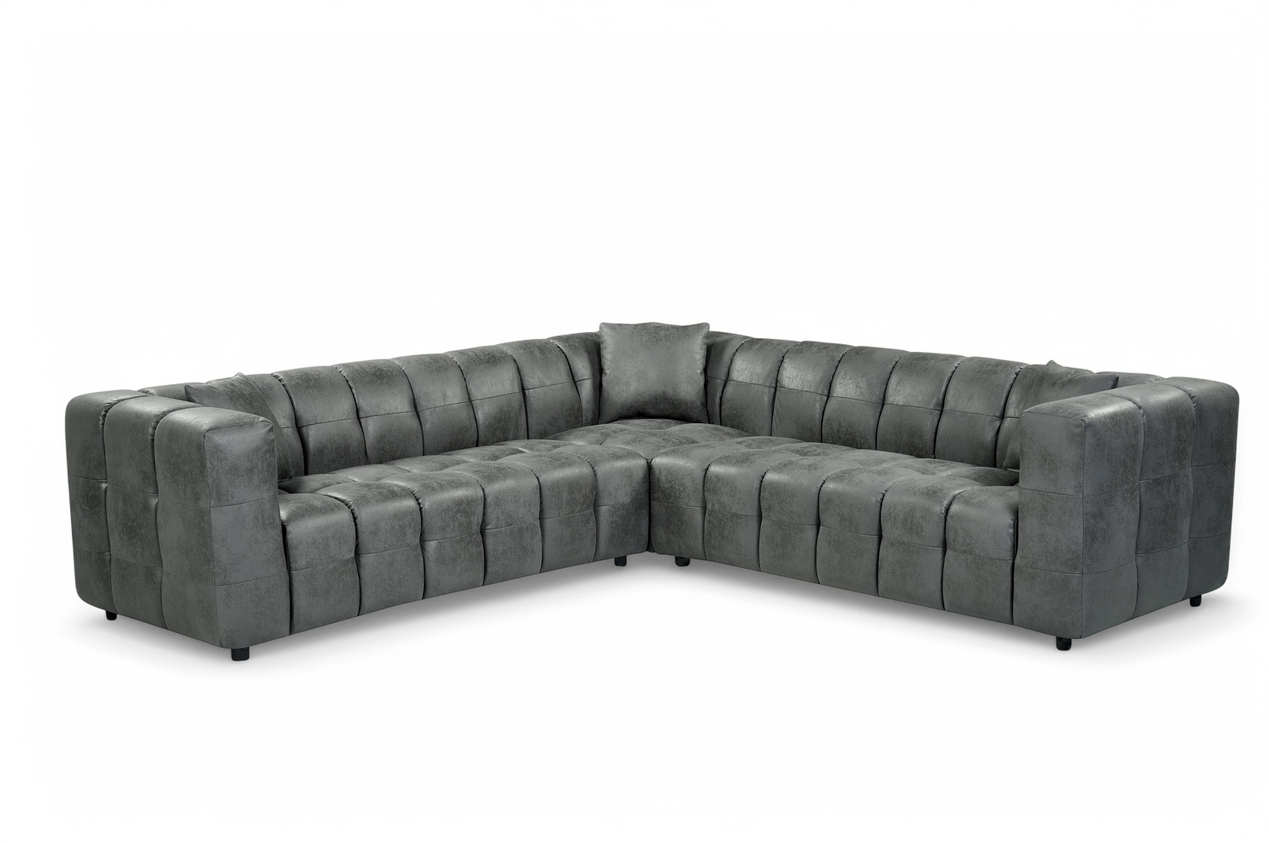 The Lugano Corner Sofa exemplifies modern design with its low profile silhouette and unique blocky structure. Ideal for modern spaces in need of a glamorous centrepiece. The Lugano range is built on a sturdy hardwood frame, with sprung seats filled with dense foam. The 2C2 configuration offers a total of 5 seats, making the Lugano Corner Sofa the perfect pick for daily use, providing both comfort and style. The upholstery showcases the unique suede-like finish on faux leather in grey, adding character and versatility; thanks to this upholstery, the Lugano Corner Sofa will suit not only modern living rooms, but industrial and mid-century ones as well.