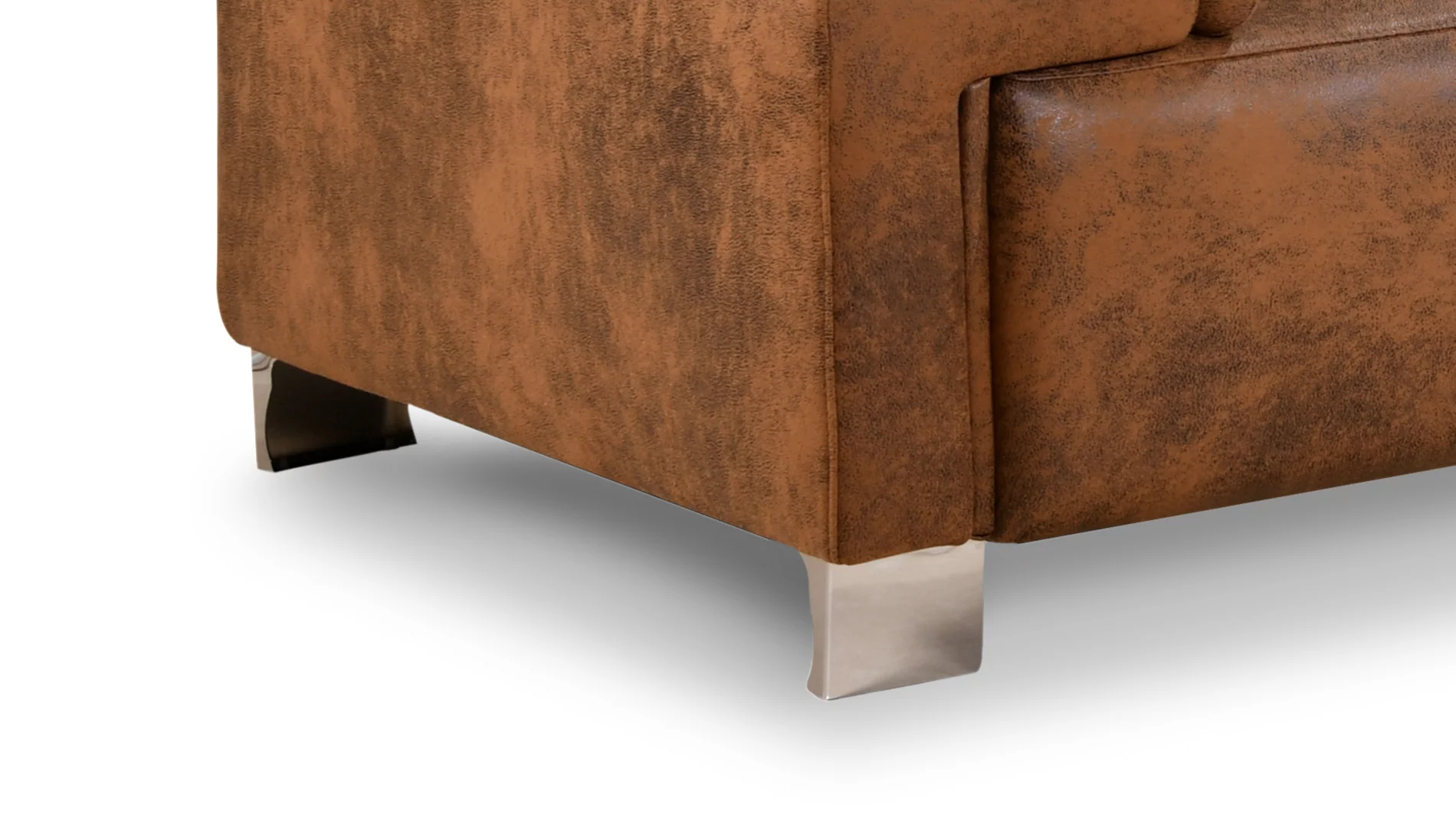 The sofa is upholstered in faux leather, a popular alternative to real leather known for its durability and resistance to peeling. It features a suede-effect finish that gives it a distinctive leather-like look, adding a touch of sophistication to the overall design. The brown colour of the upholstery is chosen for its ability to blend with a wide range of colour palettes and interior styles. The faux leather material is utilised throughout the sofa to provide a consistent and maintainable surface that is both appealing and practical for everyday use.