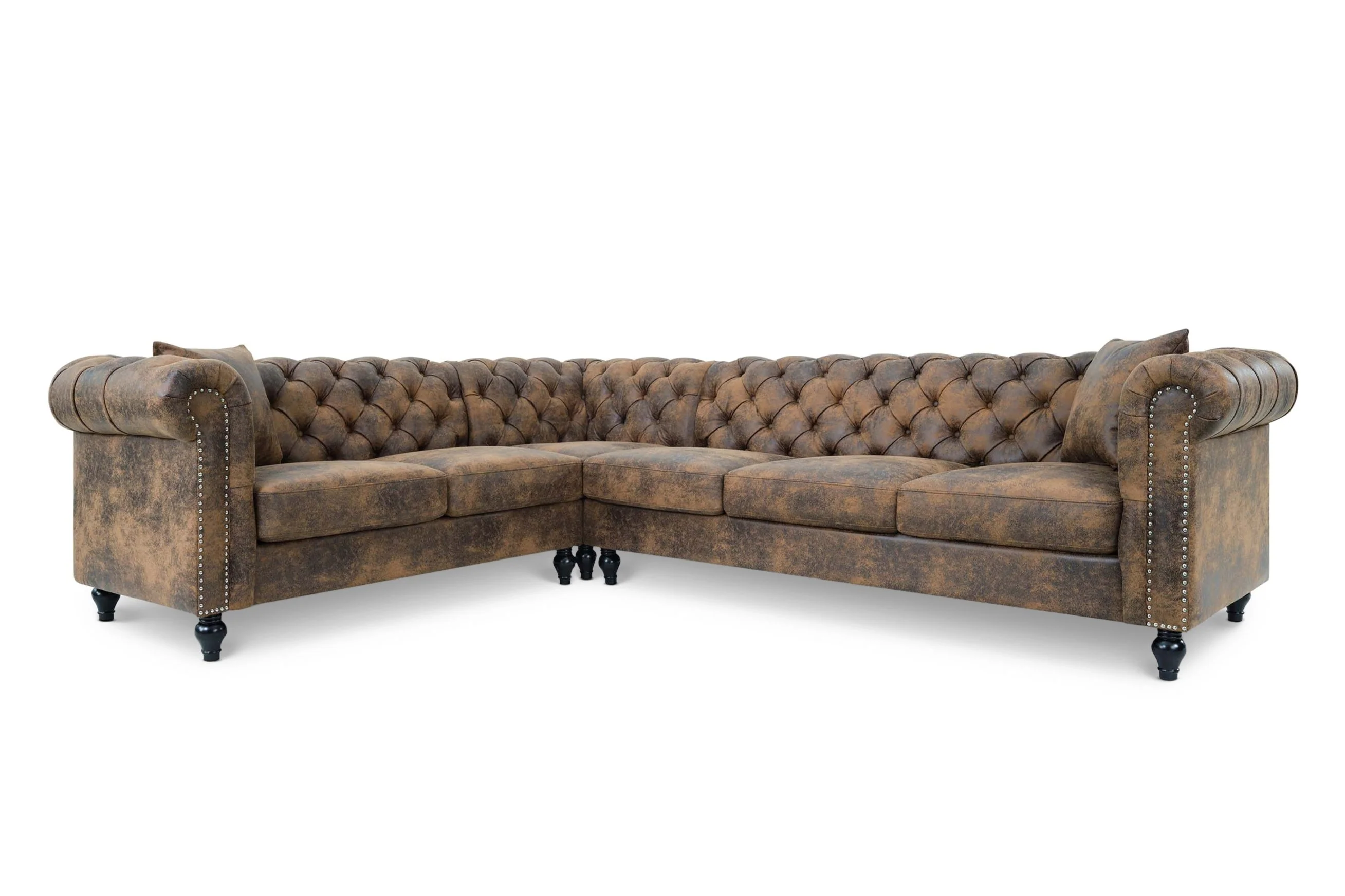 Faux Leather Suede Brown 2C3 Chesterfield Corner Sofa With Wooden Feet CAMDEN