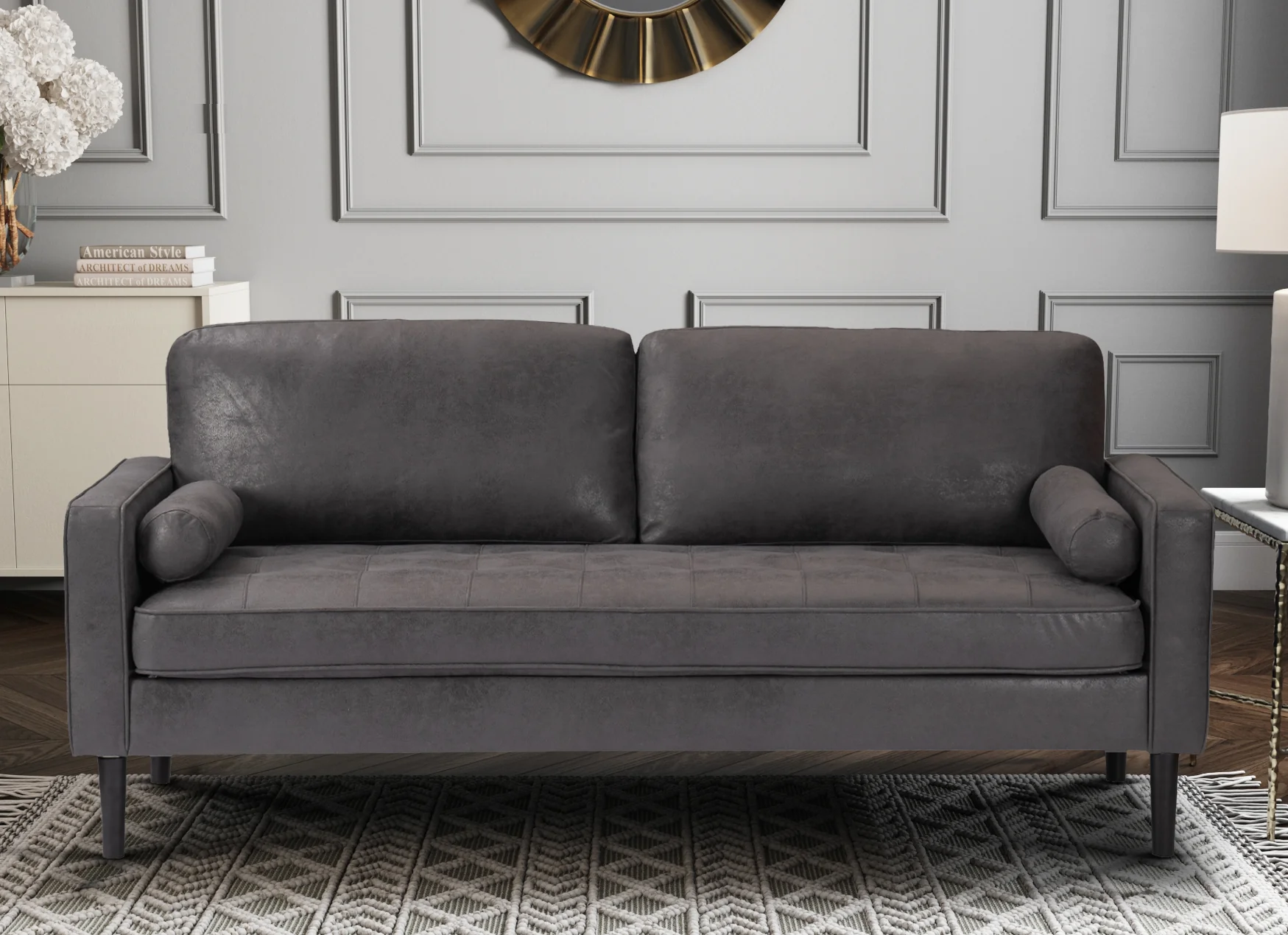 The sofa comes with foam-filled seating cushions, backrest, and arms for adequate seating support. The seating cushion additionally features decorative buttoning, adding a touch of visual interest to the overall design. The inclusion of bolster cushions complements the sofa's overall aesthetic. Upholstered in durable faux leather fabric, this sofa offers a cost-effective and low-maintenance alternative to real leather. The suede effect finish not only adds visual interest but also evokes the charm of distressed leather, creating a unique and inviting appeal. Thanks to this, the Faux Leather Suede Grey 3 Seater Brindisi Sofa is sure to fit perfectly with both contemporary, and old-fashioned interiors.