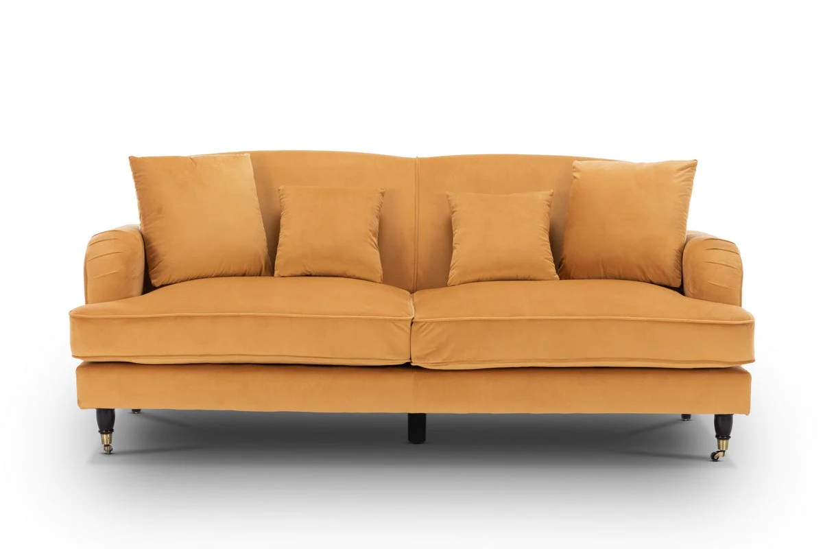 The Velvet Gold 3 Seater Ashton Sofa offers a simple yet contemporary look, combining elegance with comfort to enhance any decor. Its slightly rounded pintucked arms and clean straight lines contribute to a sleek design, while the subtly flared back cushions provide additional style and support. Sink into the plush foam-filled seating cushions, backrest, and arms for a truly relaxing lounging experience.